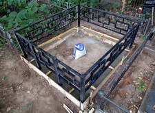 Первым делом мы демонтировали с территории участка кресты и ограждение, параллельно готовя землю к брусчатке. Когда подготовительные работы были завершены мы установили оградке, по низу которой сделали периметр из опалубки для последующей заливки бетоном.