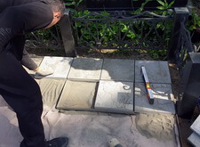 Первым делом мы взялись за установку саркофага: изготовив предварительно саркофаг, размещаем его на могиле под уровнем плитки. Предварительно территория места захоронения была полностью очищена от сорняка и прочего мусора.